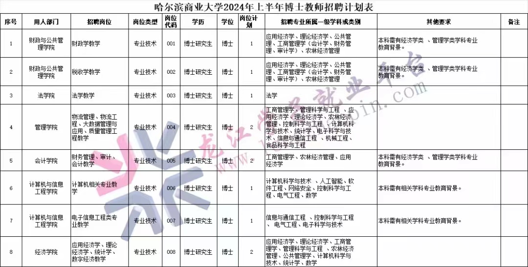 (八)各崗位的數(shù)量、專業(yè)及具體要求,詳見《哈爾濱商業(yè)大學(xué)2024年上半年博士教師招聘計劃表》(附件1)。