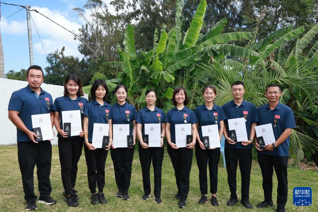 7月30日,在瓦努阿圖首都維拉港,中國(guó)援瓦醫(yī)療隊(duì)隊(duì)員手持證書合影。
